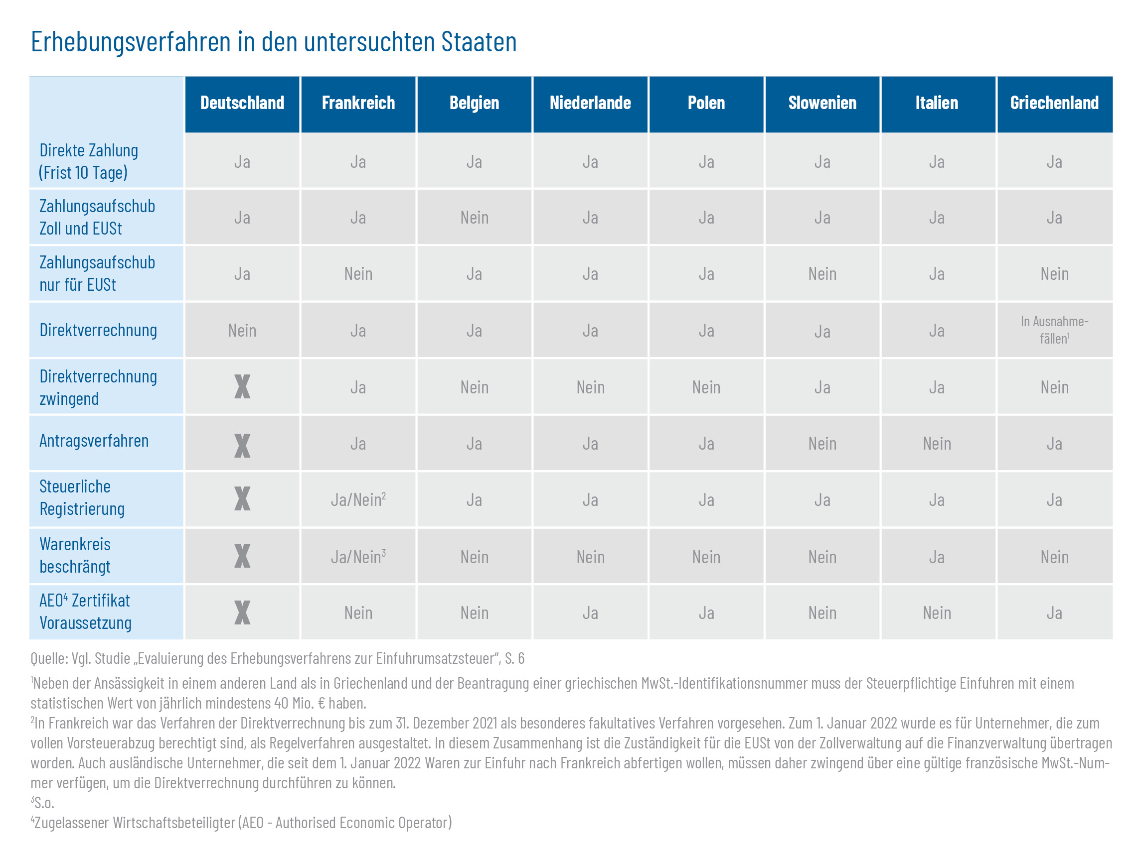 Die Studie kommt zu dem Ergebnis, dass die untersuchten Mitgliedsstaaten (anders als Deutschland), die von der durch die europäische Mehrwertsteuer-Systemrichtlinie eingeräumte Möglichkeit zur Vereinfachung des Erhebungsverfahrens der EUSt nutzen. Die Staaten haben dafür entsprechende Regelungen zur Verrechnung von EUSt und Vorsteuer in das nationale Recht eingeführt. Die einzelnen nationalen Verfahren sind jedoch unterschiedlich ausgestaltet.