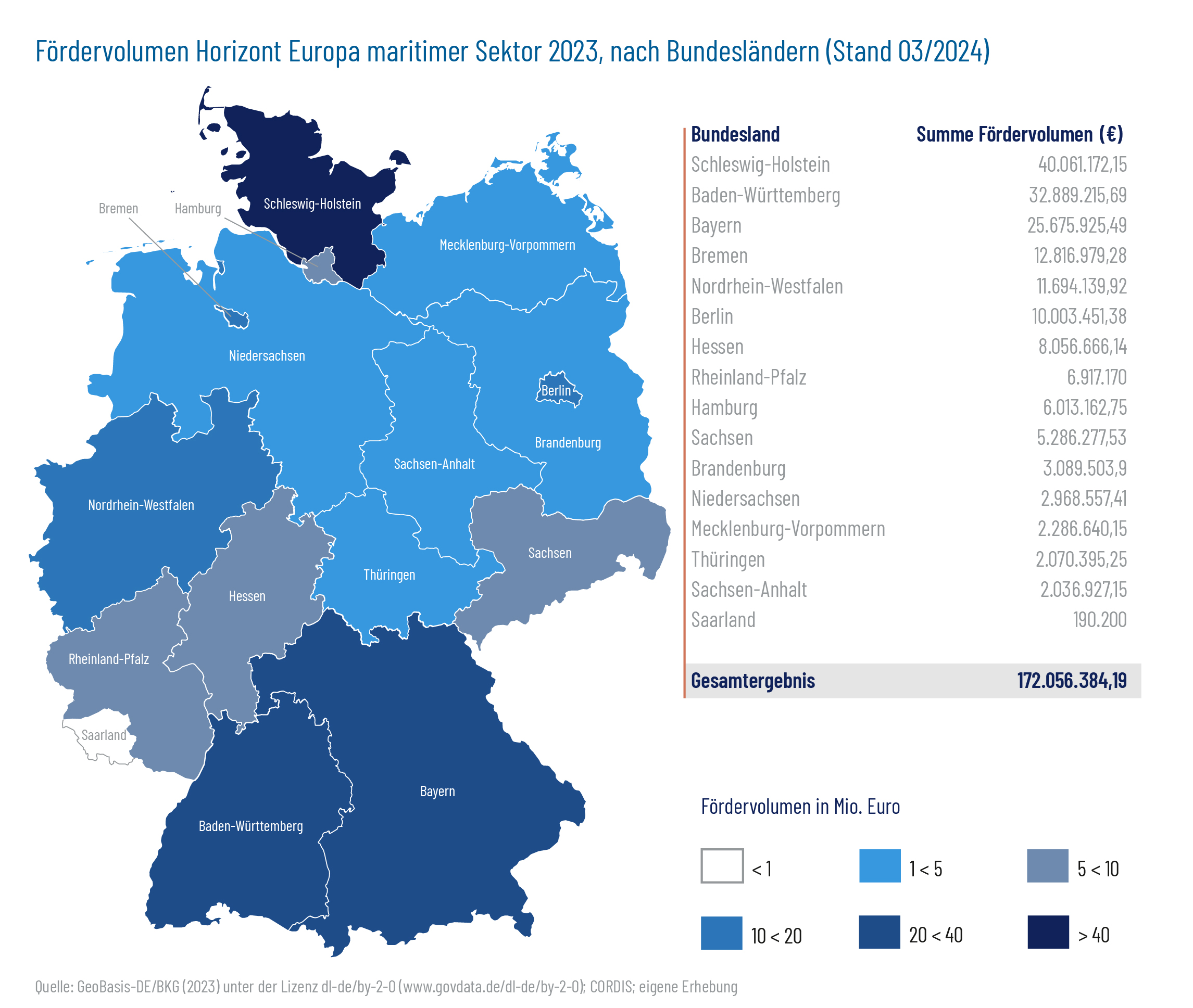 Erfreulich ist auch die Verteilung der Mittel im Maritimen Sektor: Deutsche Projektpartner konnten im betrachteten Zeitraum insgesamt ca. 171,5 Mio. Euro an Fördergeldern akquirieren.
