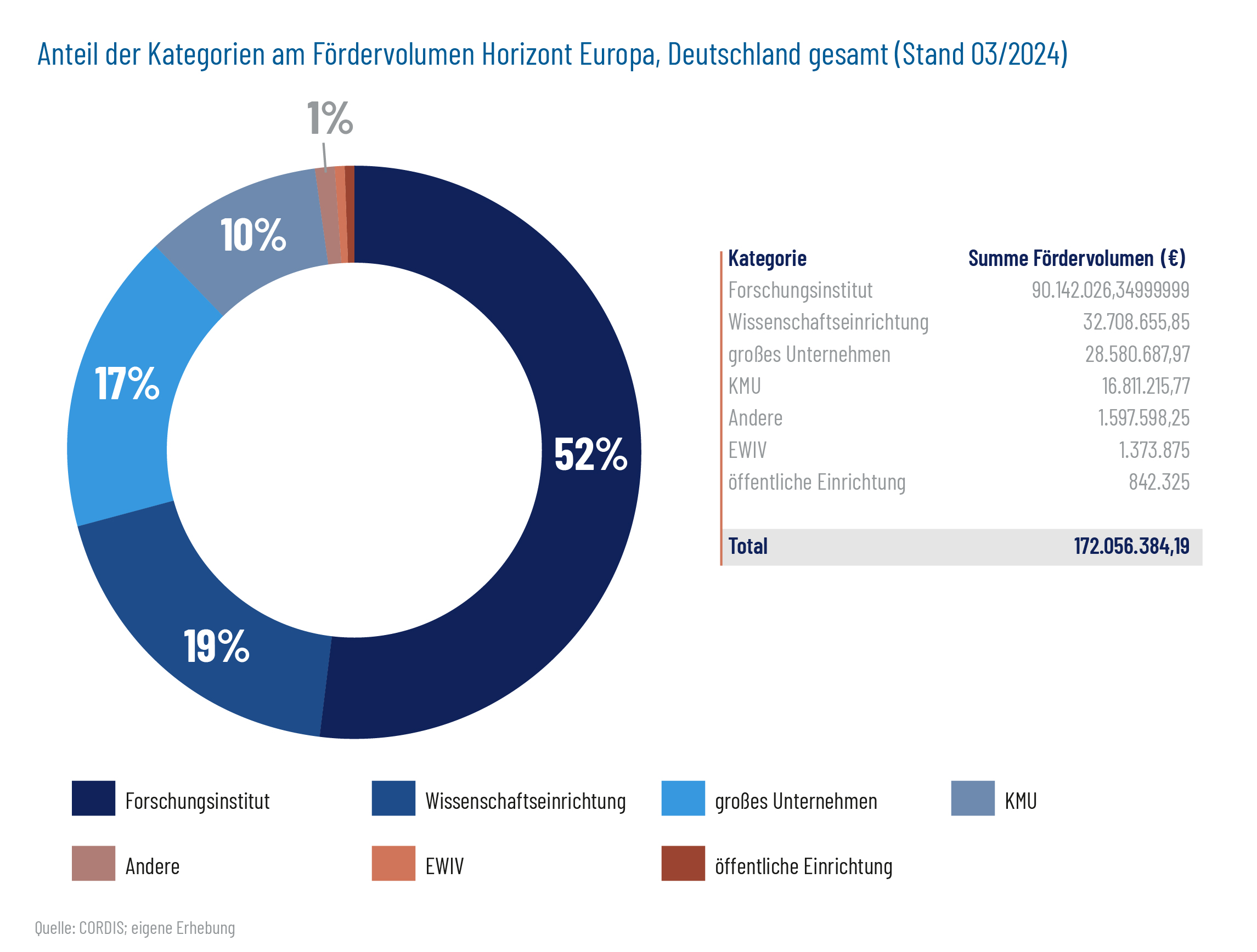 - In über 130 Projekten mit Beteiligung deutscher Einrichtungen und Unternehmen gehören die Helmholtz-Gemeinschaft, die Fraunhofer Gesellschaft, das Deutsche Zentrum für Luft und Raumfahrt, das European Molecular Biology Laboratory, Siemens Energy, das Karlsruher Institut für Technologie sowie Air Liquide zu den größten Fördermittelempfängern.