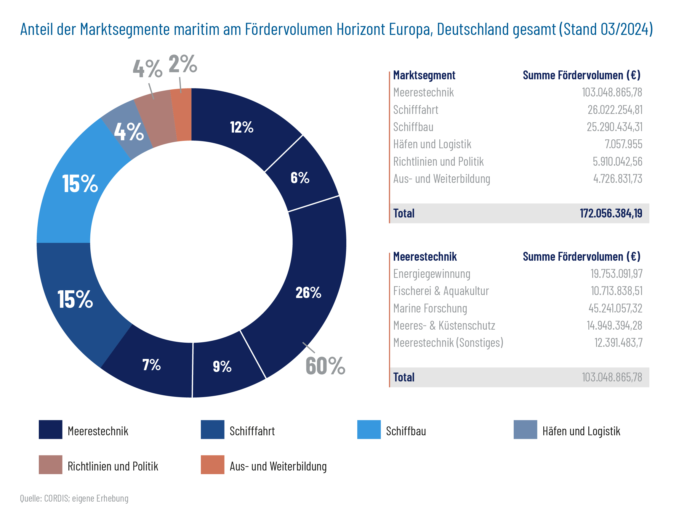 Rund zwei Drittel der maritimen Fördermittel, die mindestens einen deutschen Projektpartner einschließen, entfallen auf das Marktsegment Meerestechnik. Hier wird die Ausrichtung von Horizont Europa als Forschungsförderprogramm besonders deutlich, sind doch vor allem große Forschungs- und Wissenschaftsinstitutionen die Hauptempfänger der Mittel.