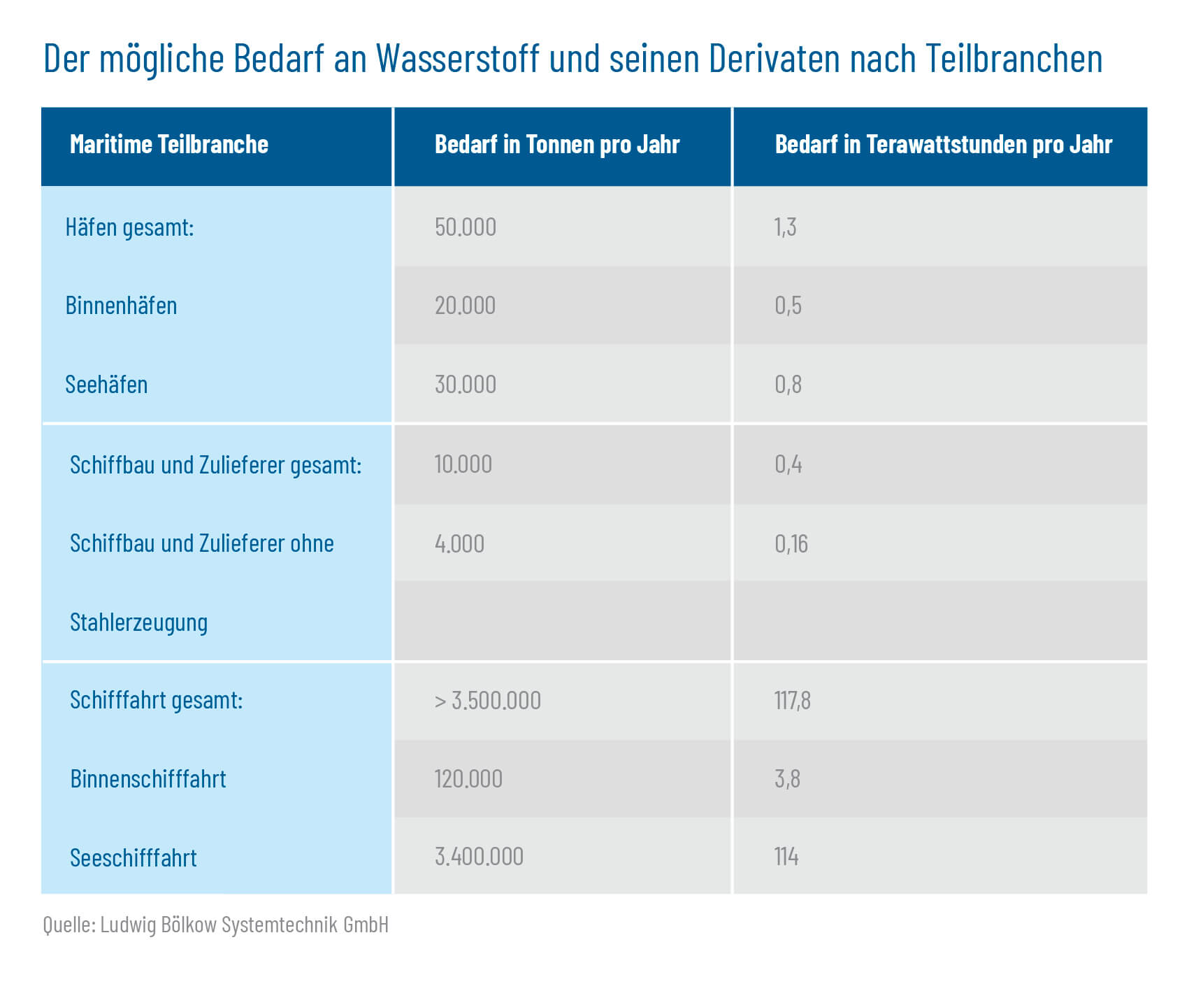 Die Studie kommt zu dem Ergebnis, dass die maritime Branche Deutschlands langfristig einen Bedarf von mehr als 3,5 Mio. Tonnen an Wasserstoff bzw. wasserstoffbasierten Kraftstoffen pro Jahr hat.