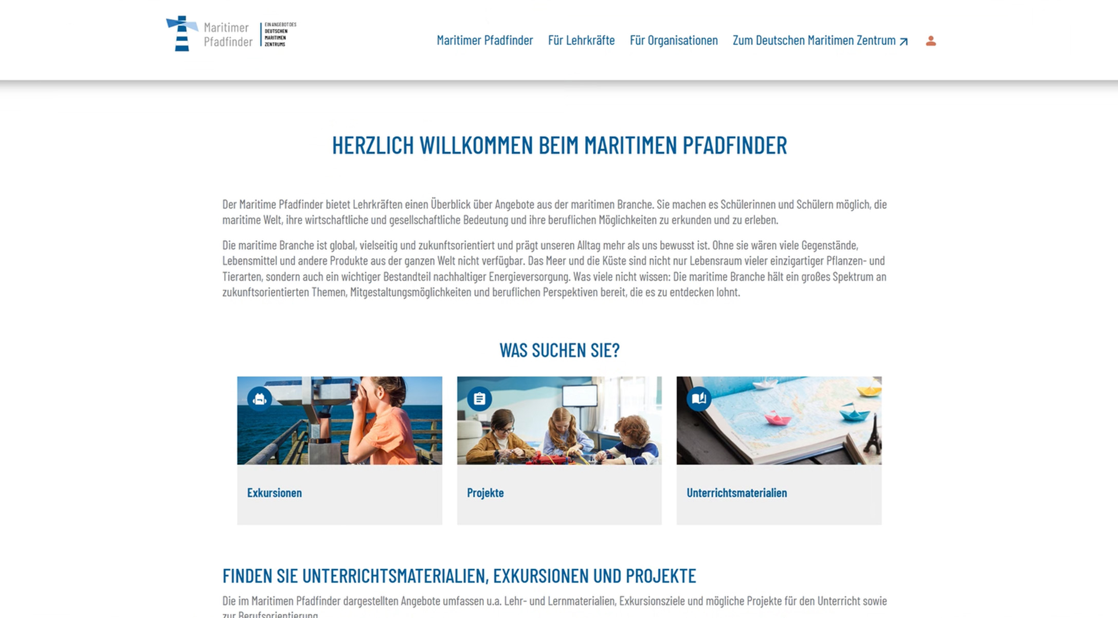 Die Plattform bietet einen Überblick über Angebote aus der maritimen Welt, wie Informations-, Lehr- und Lernmaterialien, mögliche Exkursionsziele und Kooperationen für den Unterricht sowie zur Berufsorientierung. Ergänzt werden sie durch Kurzbeschreibung, Link zum Angebot, Ort und Dauer uvm. zu den jeweiligen Angeboten. Das Angebot wird von unterschiedlichen maritimen Akteuren bereitgestellt und ständig aktualisiert.