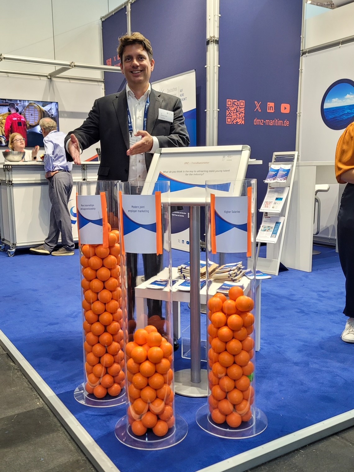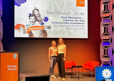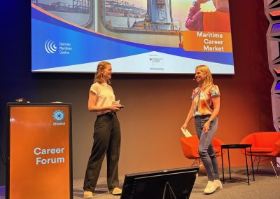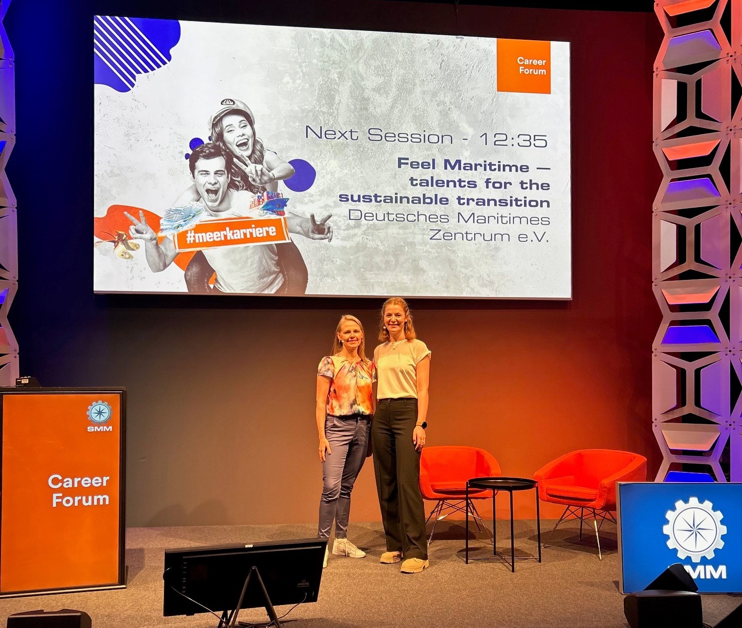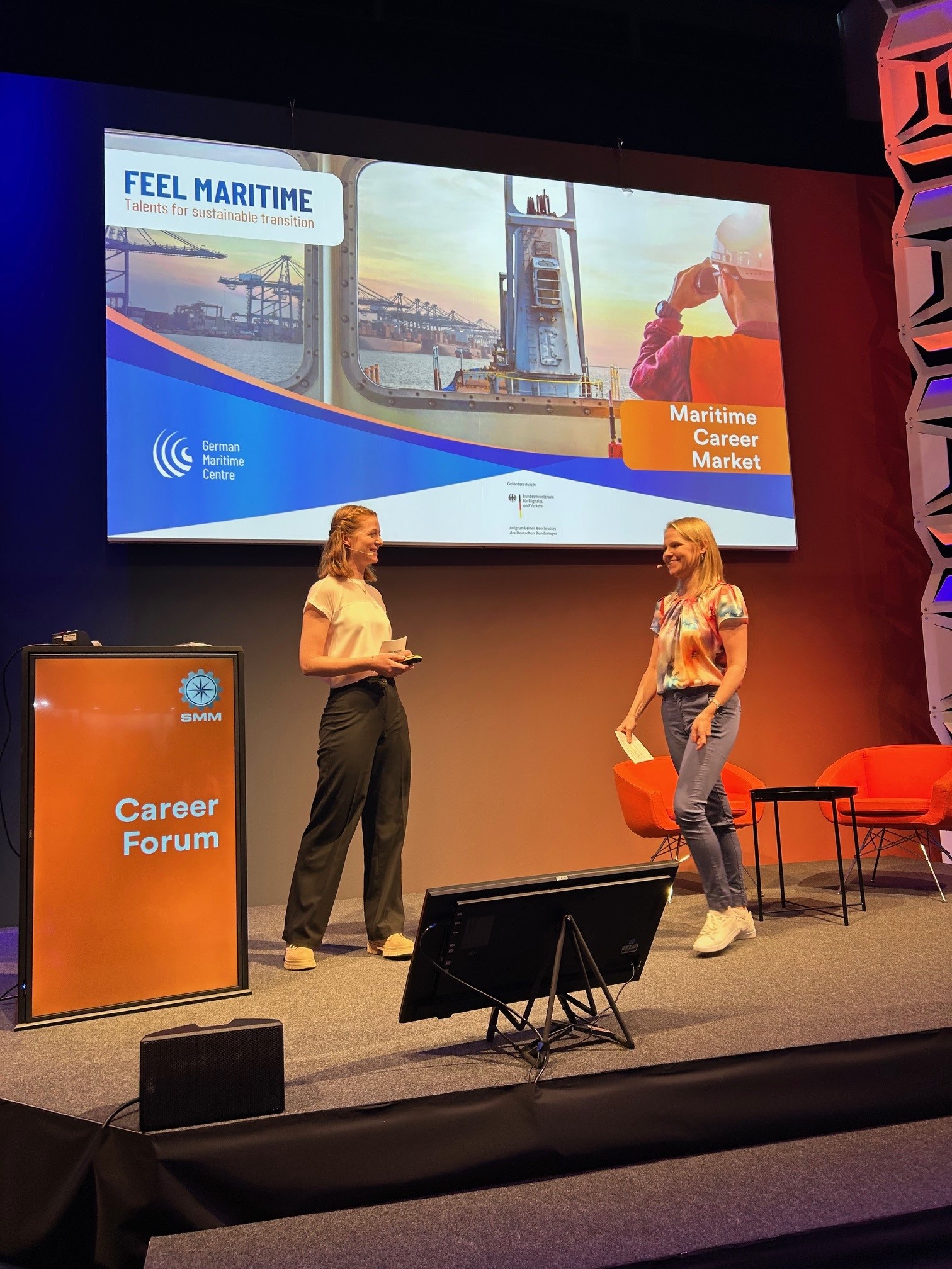 „Feel Maritime – Talents for the sustainable transition“ – unter diesem Motto haben Hanna Maurer (Referentin Soziale Medien für die maritime Branche) und Karina Tammen (Wissenschaftliche Mitarbeiterin) das Career Forum der SMM Hamburg eröffnet. In 10 Minuten stellten die beiden die vielfältigen maritimen Berufsperspektiven vor, die es jungen Menschen ermöglichen, einen Beitrag zur Energiewende zu leisten.