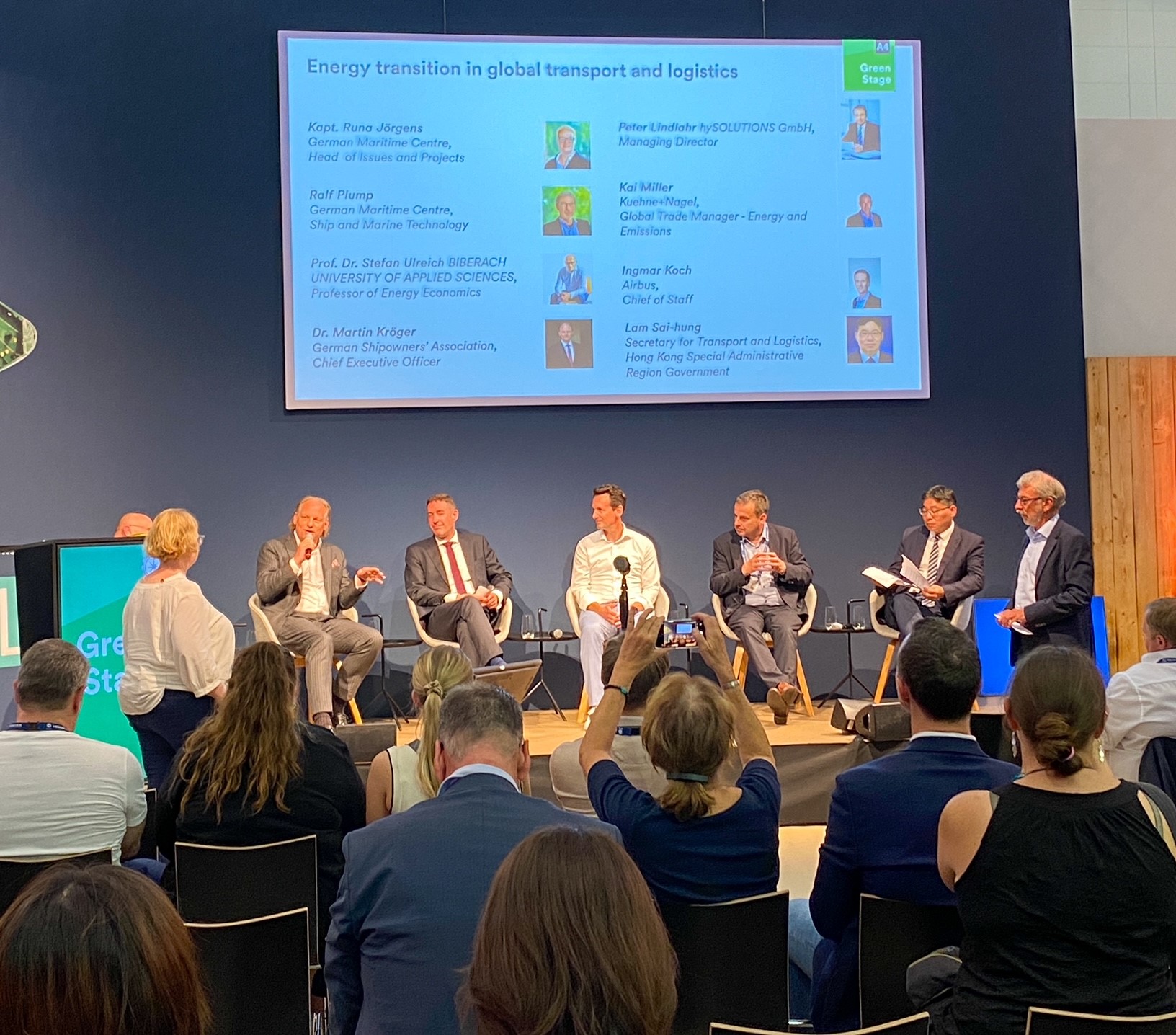Prof. Dr. Stefan Ulreich (Professor of Energy Economics, Biberach University of Applied Sciences), Dr. Martin Kröger (Chief Executive Officer, German Shipowners’ Association), Peter Lindlahr (Managing Director, hySOLUTIONS GmbH), Kai Miller (Global Trade Manager – Energy and Emissions, Kuehne+Nagel) , Ingmar Koch (Chief of Staff, Airbus), Sai-hung Lam (Hong Kong Special Administrative Region Government Secretary for Transport and Logistics)